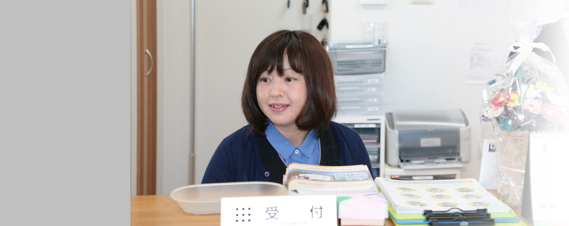 普段は受付や電話対応をさせていただいています。患者様やご家族様に安心・信頼していただけるよう明るく和やかな笑顔での応対を心掛けています。 当院のスタッフは皆、親切で思いやりのある人ばかりです。皆さんを見習って自分自身も患者様やご家族様のお役に立てるよう日々、努力していきたいと思いますのでよろしくお願い致します。 休日は家族や友人とショッピングや食べ歩きなどを楽しんでいます。