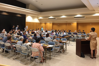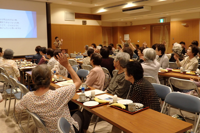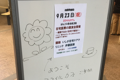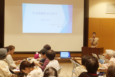 当日は、天候に恵まれたため小学校の運動会と重なり、参加者数が心配でしたが、94名の参加者があり、スマイルカフェの講演会(在宅医療を学ぼう)が無事に開催できたこと、改めて御礼申し上げます。大変お忙しい中、いしが在宅ケアクリニックの伊藤先生、中村事務長様ありがとうございました。また、クリニックのスタッフの皆様には、お手伝いもしていただきありがとうございました。